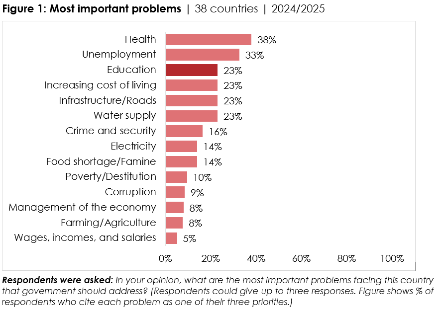 According to Afrobarometer, education is now tied with the rising cost of living, infrastructure and water supply as one of the top three problems demanding urgent government attention.